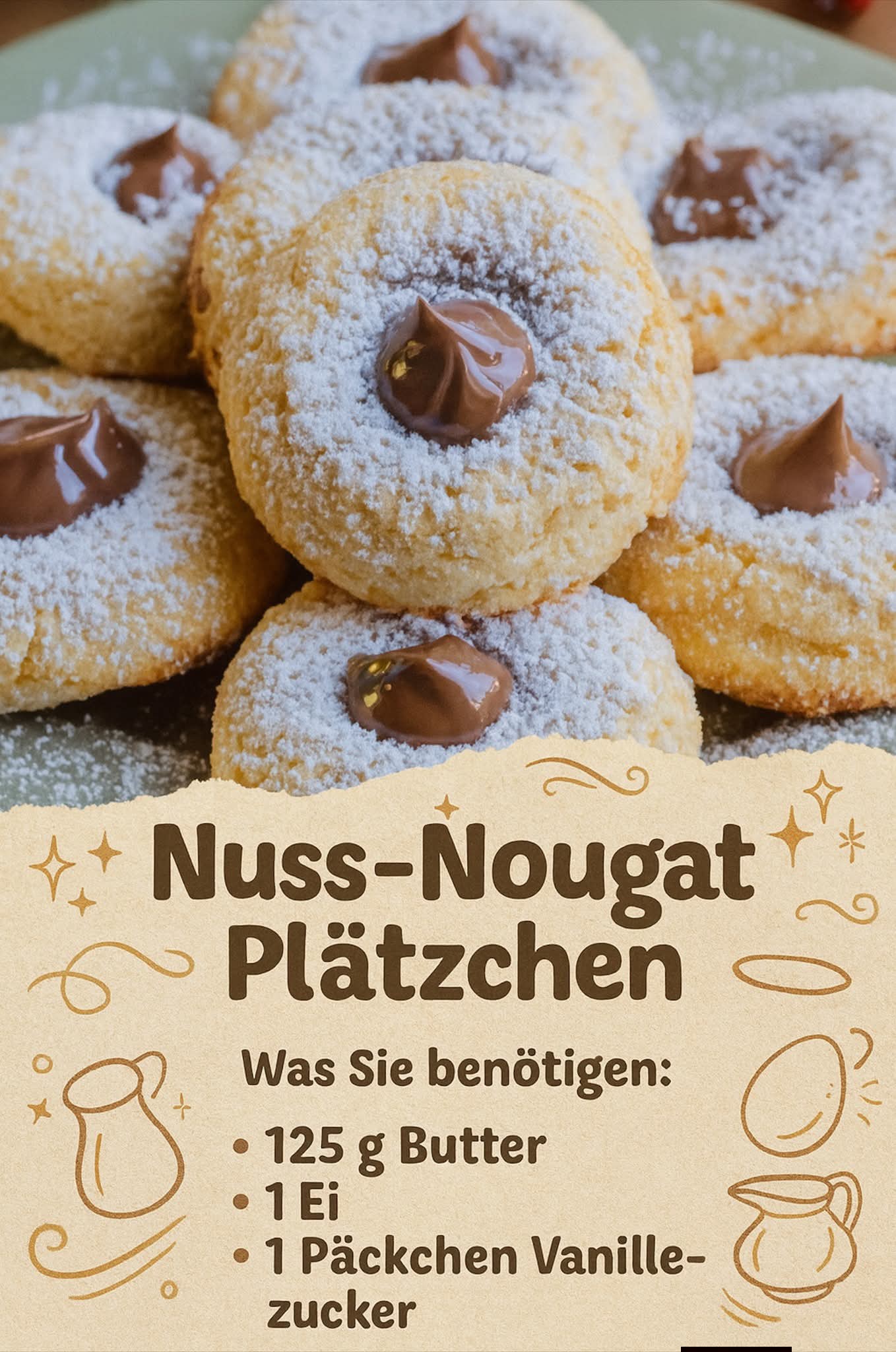 Nuss-Nougat in Plätzchenform? Einfach himmlisch 𝗭𝗨𝗧𝗔𝗧𝗘𝗡: ● 125 g Butter, zimmerwarm ● 1 Ei ● 1 Päckchen Vanillezucker ● 100 g Puderzucker ● 100 g gemahlene Haselnüsse (oder Mandeln) ● 150 g Mehl ● 100 g schnittfestes Nuss-Nougat ● Optional: Puderzucker zum Bestäuben oder geschmolzene Schokola