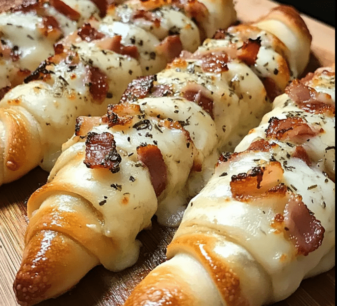 Pizza-Twists mit Knoblauchbutter und Putenspeck und Alfredo-Soße Zutaten: 1 Pfund Pizzateig 1 Tasse Alfredo-Soße 6 Scheiben Putenspeck, gekocht und zerbröselt 1 Tasse geriebener Mozzarella 3 Esslöffel Butter, geschmolzen 2 Knoblauchzehen, gehackt 2 Esslöffel gehackte Petersilie (optional) Anleitung: