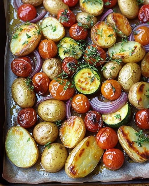🛒 Zutaten: 🥔 500 g kleine Kartoffeln (am besten jung) 🍅 300 g Kirschtomaten 🥒 1 kleine Zucchini 🧅 1 rote Zwiebel 🌿 Einige Zweige frischer Thymian 🧄 2 Knoblauchzehen (optional, für zusätzlichen Geschmack) 🫒 4 Esslöffel natives Olivenöl extra 🧂 Meersalz nach Geschmack 🌶️ Frisch gemahlener schwarzer Pfeffer nach Geschmack 🧑🍳 Zubereitung: